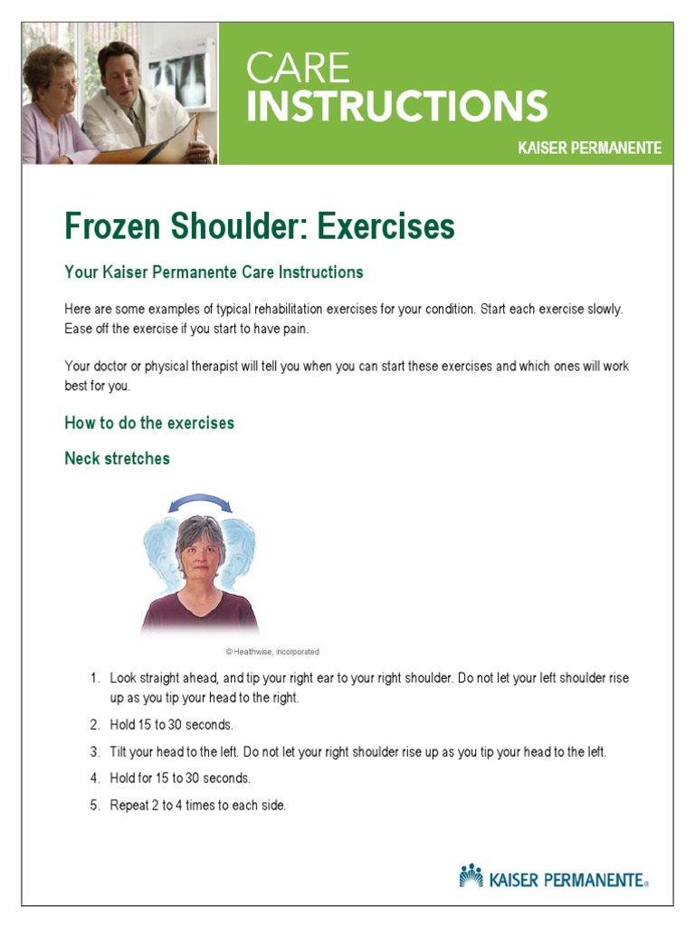 4 Hold this position for 20 to 30 seconds. Press down on ball. Up to 24 cash back Shoulder impingement exercises pdf kaiser permanente medical clinic hours slide 4 of 16 Overhead stretch Standing about an arms length away grasp onto a solid surface.